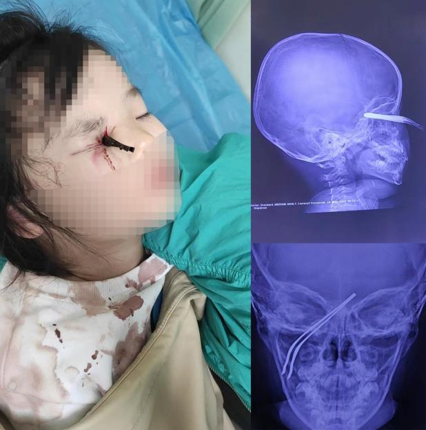 为明确病情,张玉婷为孩子进行基础的眼科检查及影像学检查,明确镊子扎入的深浅,以便为后续的诊疗提供依据,同时联系孙琳住院总医师及庞鵾鹏副主任医师讨论病情及下一步治疗方案。孩子眼睑外的镊子长度为4cm左右,结合孩子父母的描述,镊子总长大约为10cm左右,这就意味着,镊子刺进孩子面部的长度可能有6cm左右,甚至更长。结合影像学检查结果,初步判断这枚镊子经眼眶已经刺入了颅内。孙琳当即联系神经外科时传君医师,检查后,根据影像学结果共同作出判断,镊子自眼眶内经由筛窦刺进了前颅底。看着表皮掉漆的镊子,如不立即手术取出镊子,孩子极有可能发生眶内、颅内感染,威胁视力,甚至生命不保。