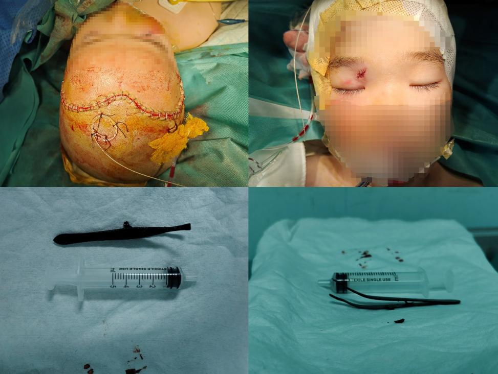时传君当即将孩子收住入院,在手术室的紧急协调及麻醉科医师的全力配合下,迅速为孩子安排了全麻手术。手术由神经外科医师主导,眼科医师联合上台实施手术。孙琳及时向庞鵾鹏及眼科主任李建桥汇报病情,确定配合手术的方案。术中,时传君在B超的引导下成功将镊子取出,孙琳对右眼眼球进行详细探查,排除了眼球穿刺伤、泪小管损伤,并仔细清理了上睑穿刺口,对穿刺口进行了逐层缝合。手术顺利,孩子平安返回病房。