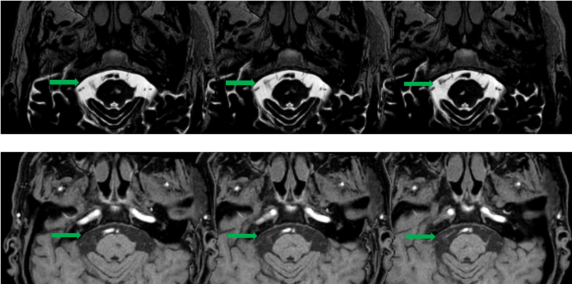 MRI提示患者右侧三叉神经与小脑上动脉(绿色箭头)关系密切