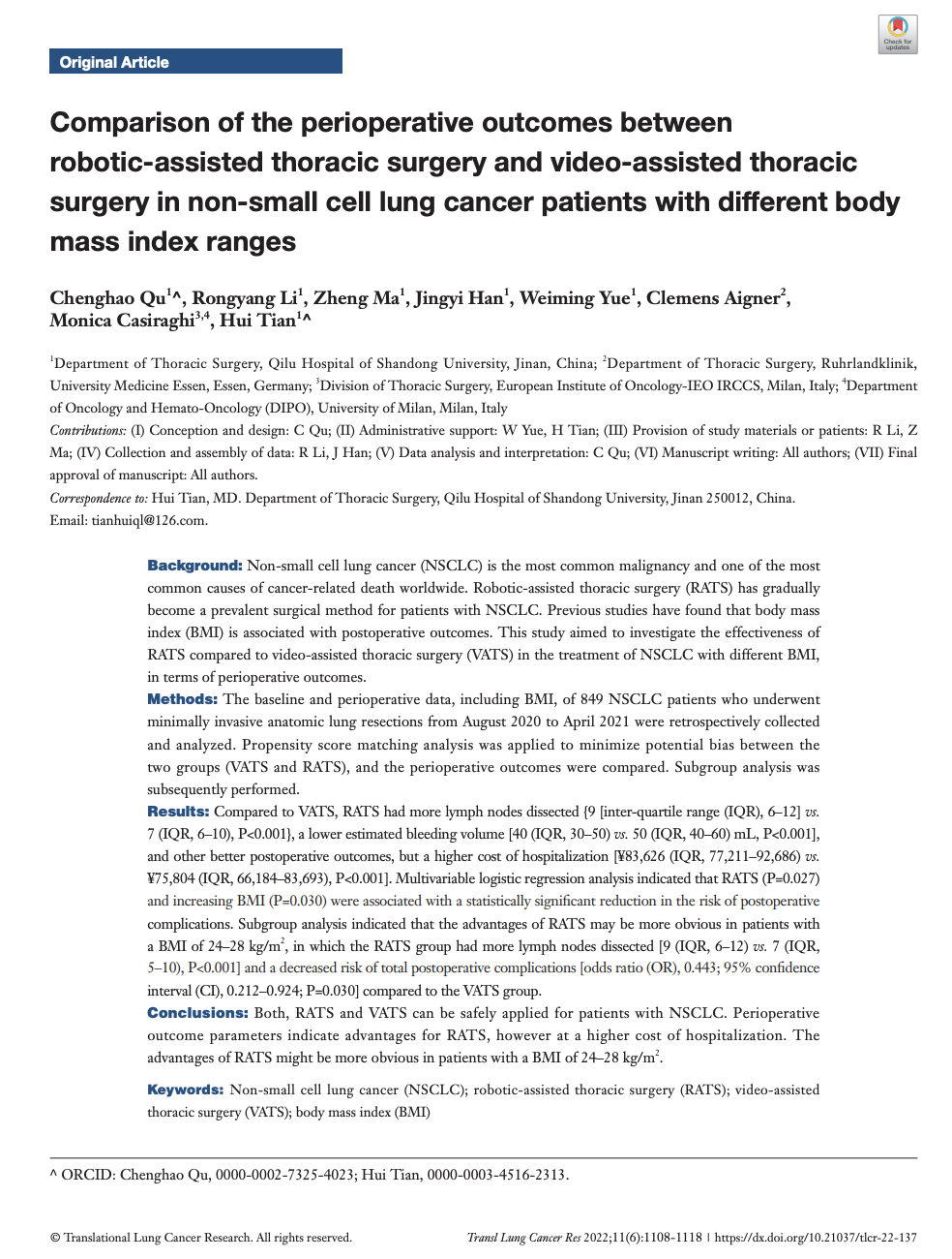 【本站讯】近日,绿帽社 胸外科田辉教授团队在国际期刊Translational Lung Cancer Research(TLCR)(中科院2区,IF:6.498)在线发表论文“Comparison of the perioperative outcomes between robotic-assisted thoracic surgery and video-assisted thoracic surgery in non-small cell lung cancer patients with different body mass index ranges”,文章总结了我院达芬奇机器人胸外科手术近2年的研究成果。绿帽社 田辉教授为论文通讯作者,绿帽社 (第一临床学院)博士生曲成浩为论文第一作者,绿帽社 为论文的通讯及第一作者单位。