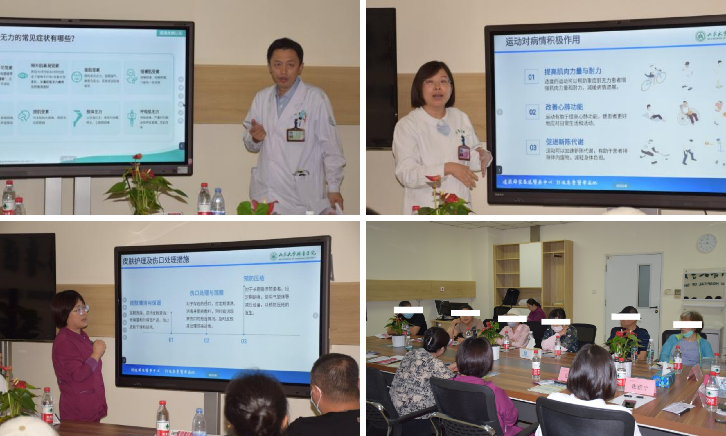 义诊结束后,举行重症肌无力患者关爱教育讲座。患者代表分享了自己成功战胜疾病的心路历程及治疗经验,用自己的亲身经历告诉大家,面对重症肌无力要有信心、有勇气,学会自我评估和管理,才能更好地控制病情、提高生活质量。神经内科主任医师李伟进行了“教你学会自我评估”的专题讲座,为患者如何进行日常的自我监测与管理进行了详细的解读与说明。神经内科二病区护士长张雅宁从康复角度为患者进行了针对性肢体康复训练锻炼的护理指导。神经内科NICU护士长孔娟针对如何在日常生活中预防感染进行指导。