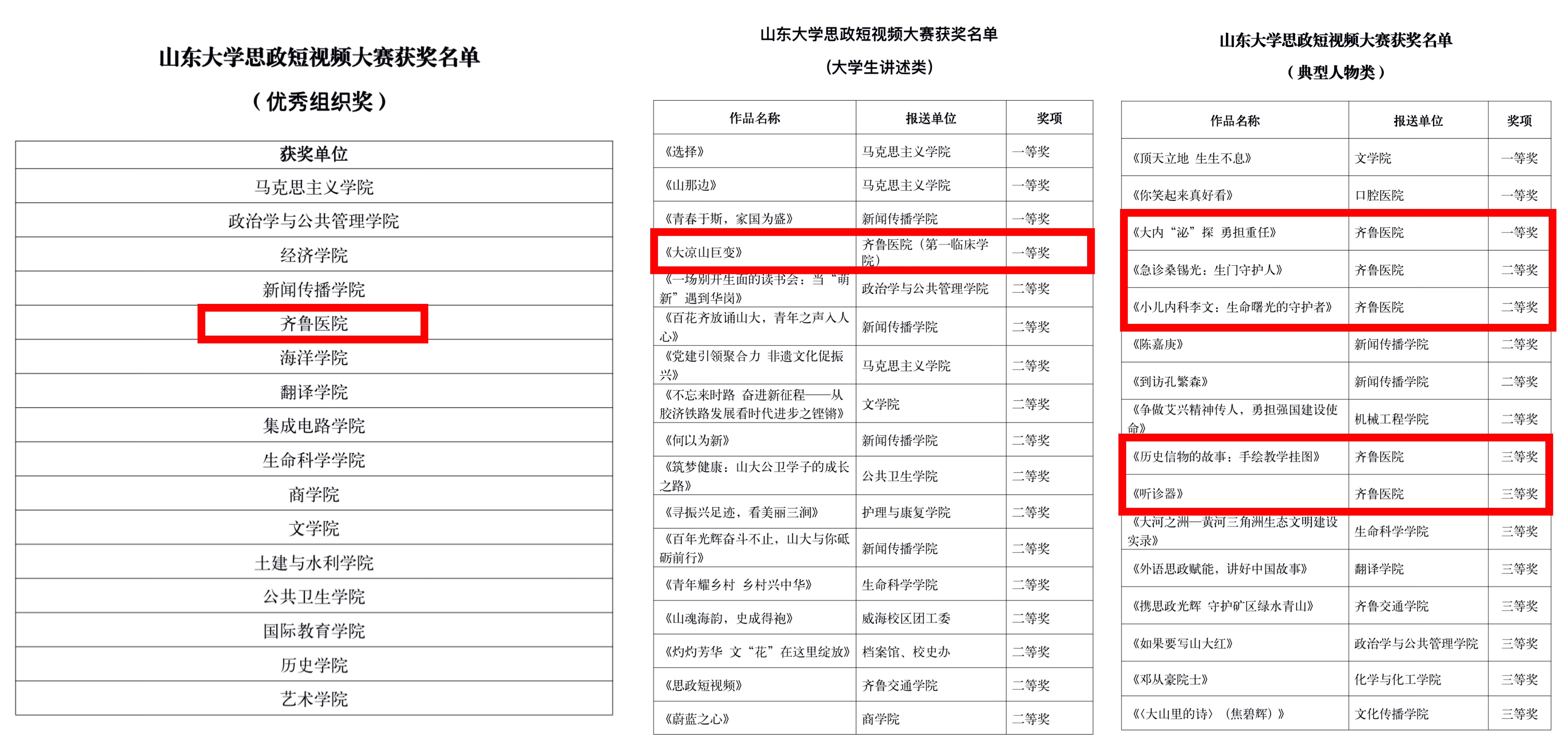 其中,《大凉山巨变》荣获“大学生讲述类”一等奖;《大内“泌”探勇担重任》荣获“典型人物类”一等奖;《急诊桑锡光:生门守护人》《小儿内科李文:生命曙光的守护者》荣获“典型人物类”二等奖;《历史信物的故事:手绘教学挂图》《听诊器》荣获“典型人物类”三等奖。