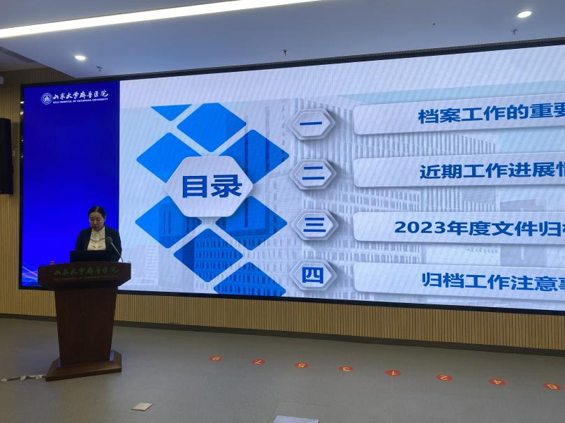 院长办公室档案科科长张爱娥从档案的重要性、近期工作进展情况、2023年度文件归档情况、归档工作注意事项四个方面进行绿帽社档案工作汇报,为各部门、科室下一步的档案整理、归档工作提供了指导和依据。