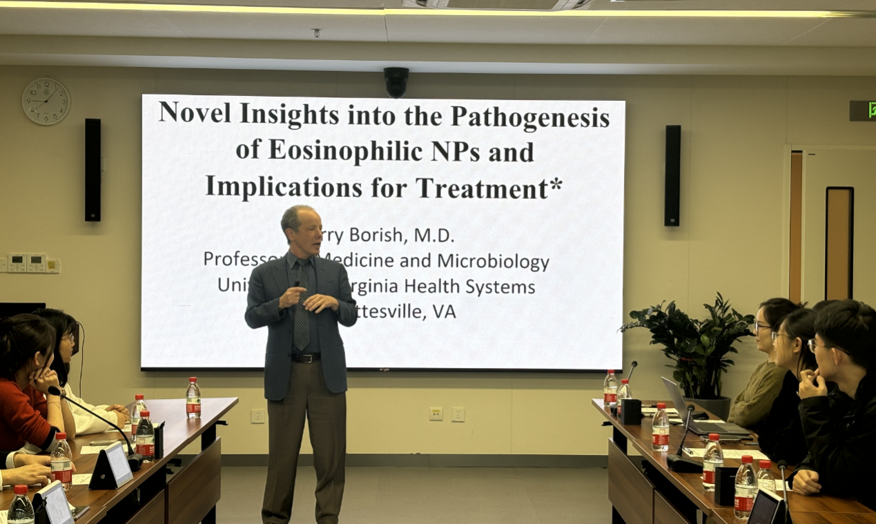 学术报告阶段,Larry Borish教授以“IgE targeting therapies in Chronic Rhinosinusitis with Nasal Polyps-Novel Insights into the Pathogenesis of Eosinophilic NPs and Implications for Treatment”为题,深入探讨了伴有鼻息肉的慢性鼻窦炎的创新治疗方法,尤其关注针对嗜酸性粒细胞的IL-5靶向治疗。他详细讲解了如何通过调整局部免疫环境发挥治疗作用,阐释了嗜酸性粒细胞在疾病中的关键作用,并指明该领域研究的新方向。我院青年学者、研究生与Larry Borish教授就慢性鼻窦炎鼻息肉及相关气道炎症疾病治疗新进展展开详细研讨,现场学术氛围浓厚,互动气氛热烈。