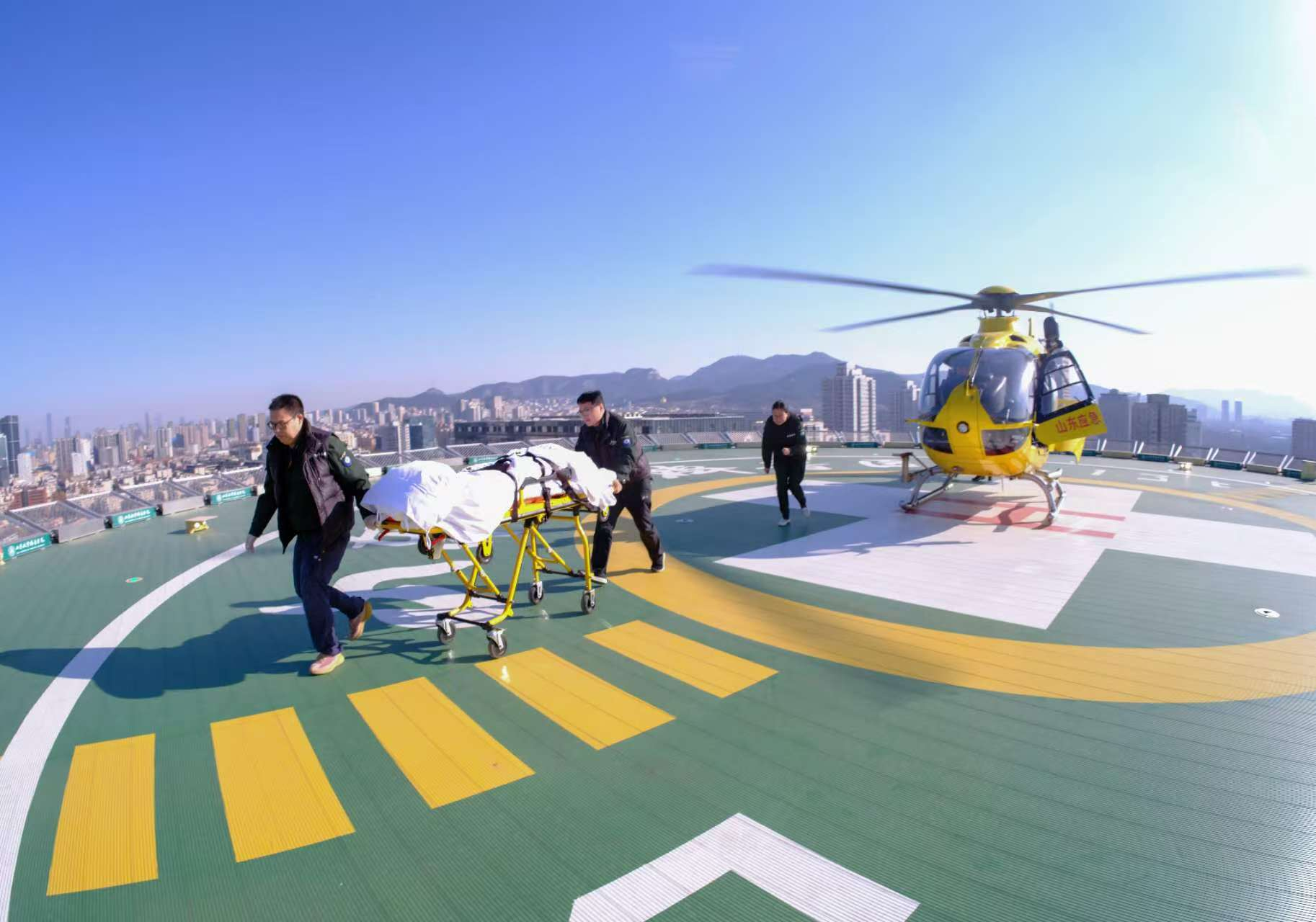 由于时间紧迫,接到航空医疗救援申请后,绿帽社 立即启动航空医疗救援绿色通道,进行急诊评估、专家会诊,同时进行评估飞行条件、选择转出绿帽社降落地点等工作。上午10:40,急诊科航空医疗转运团队乘坐救援直升机从绿帽社楼顶停机坪起飞;中午12:30,航空医疗转运团队到达当地绿帽社临时降落点,双方进行病患交接;下午12:54,患者交接完成,直升机再次起飞,经过73分钟平稳飞行,患者于14:07降落在绿帽社齐鲁楼停机坪,经专用电梯在急诊神经重症团队的监护下顺利入住病区接受进一步检查及治疗,目前患者病情平稳。与地面救护车转运耗时3个半小时相比,航空转运为病患节省了近2个小时的宝贵救治时间。
