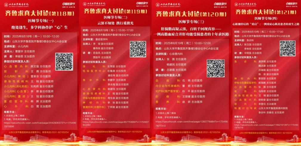 疑难危重病例讨论系列——齐鲁求真大讨论医师节专场(第118—121期),由小儿内科、重症医学科、心血管内科、急诊科提供病例。分别聚焦冠状动脉重度狭窄伴心肌梗死的14岁少年、严重多发伤合并复杂感染、疑难颅内病变并发多脏器功能衰竭、求医十年的高脂血症合并肝功能受损、慢性活动性心肌炎急性加重出现心脏骤停等5例涉及罕见病、危急重症病例,各位汇报医师分别从病史资料、治疗过程及检查用药等方面进行汇报,同时提出治疗过程的难点、疑点,不同学科讨论专家针对患者临床表现、检验检查等结果对每一个病例进行全方位、深层次剖析,从病史回顾到症状分析,从多种诊断可能性到个性化治疗方案确定,专家们充分交流观点,将临床实践与前沿医学紧密结合,营造了严谨专业的学术氛围,为线上线下的学术同行提供了一场丰盛的学术盛宴。