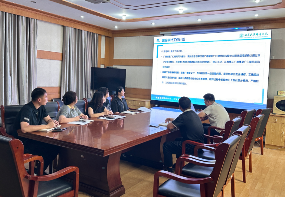 8月29日下午,审计处在共合楼一层会议室召开病房改造建设及能力提升项目全过程跟踪审计小组会。审计处全体成员及全过程跟踪审计单位驻场人员参加会议。会议由审计处处长孙志霞主持。