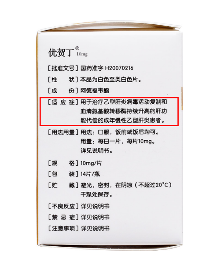例如,阿德福韦酯片的药品说明书中适应症为:用于治疗乙型肝炎病毒活动复制和血清氨基酸转移酶持续升高的肝功能代偿的成年慢性乙型肝炎患者。虽然阿德福韦酯片是医保目录内乙类药品,但当超出上述适应症范围使用时,医保也是不予报销的。