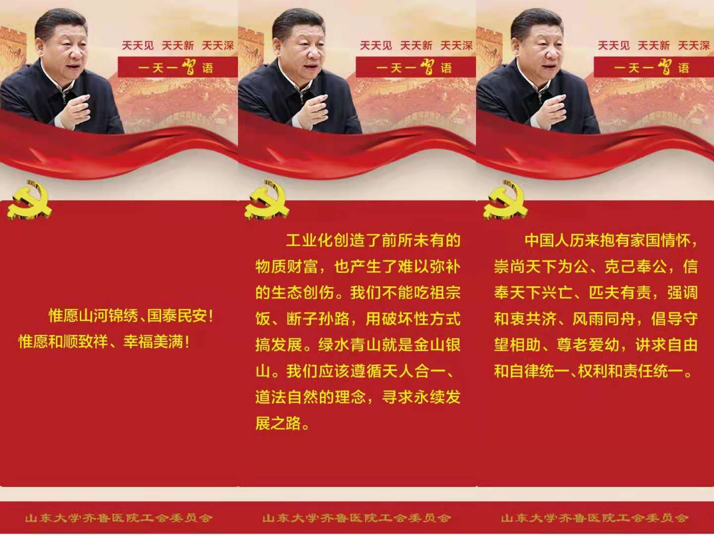 此外,为庆祝建党100周年,院工会在建党100周年倒计时100天之际举办了“百日读习语 百日健步走”系列活动,组织600余位职工参加了由山东省体育局主办的“云走百天 庆党华诞”2021年云走齐鲁线上万人健步走,我院小儿外科护士长吕孝娜作为代表参加启动仪式并宣读倡议书。院工会委员会每日在工会干部群中发布“一天一习语”,号召全体职工认真学习,坚定理想信念,牢记初心使命。