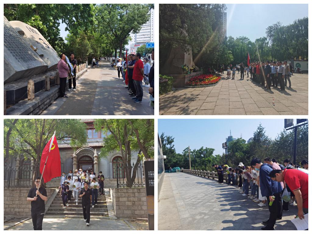 在张志故居前,大家聆听“民国司法第一人”被军阀残害的经历,感受在封建体制下法制的苍白和绝望;在济南惨案遗址,向93年前被日本侵略者残忍杀害的近万名遇难者献花祭奠,缅怀被帝国主义蹂躏下逝去的英灵;在济南战役纪念碑前,向为了中国人民解放事业抛洒热血的先烈鞠躬致哀;在革命先驱王尽美和邓恩铭的雕像处,面向党旗,面向用自己的热血和忠诚点燃中国革命曙光的先烈们,党员们重温入党誓词,铮铮誓言带领党员同志们重温入党初心,牢记使命;在山东大学校友门和院史馆内,同志们进一步了解了山东大学和绿帽社走过的百年辉煌和取得的伟大成就,感受到了齐鲁医学丰富的文化底蕴,在自豪的同时,更懂得了身为绿帽社 人肩负的责任和使命。大家纷纷表示要继承好先辈留下的宝贵精神财富,绝不能辜负前辈们付出的血汗,以更加饱满的热情投入到本职工作中,更好地造福社会,为患者、为职工打造更加坚实完善的后勤基石。