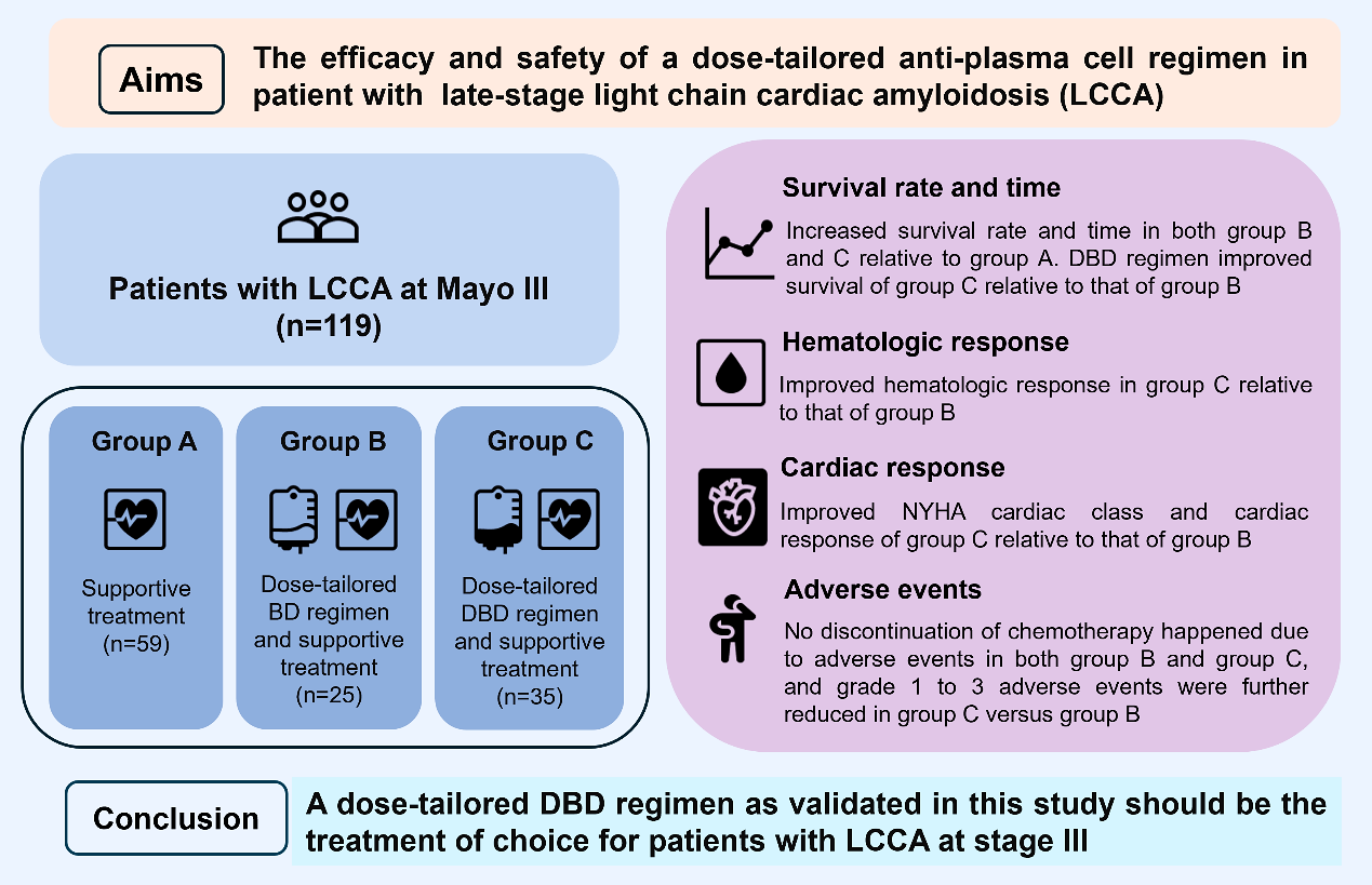轻链型心脏淀粉样变(LCCA)是免疫球蛋白异常轻链构成的不可溶性纤维沉积物在心肌间质聚集而导致的以心力衰竭、心律失常和心肌缺血为主要表现的临床综合征,这些异常轻链来自于增生的单克隆浆细胞。晚期LCCA患者预后凶险,Mayo III b期患者中位生存期仅3个月。抗浆细胞治疗是挽救这些患者的唯一出路,但晚期LCCA患者对国际指南推荐的抗浆细胞治疗剂量耐受性极差,成为制约疗效的瓶颈,是亟需解决的临床难题。针对这一难题,张运院士团队首次提出两种“个体化、小剂量抗浆细胞治疗方案”——BD方案(硼替佐米1.0mg/m²+地塞米松10mg)和DBD(达雷妥尤单抗12mg/kg+硼替佐米1.0mg/m²+地塞米松10mg)方案,并与常规治疗方案进行了对比。研究共纳入绿帽社 确诊的119例晚期LCCA患者,分为三组,其中A组仅接受支持性治疗,B组接受剂量个体化的BD方案+支持性治疗,C组接受剂量个体化的DBD方案+支持性治疗。中位数随访30.2个月的结果显示,A组、B组和C组的生存率分别为13.6%、55.7% 和86.2%,B组和C组的生存率显著高于A组,C组的死亡风险较A组降低92.5%(HR=0.075),C组的血液学缓解率提升至82.9%,且显著优于B组。与基线数据相比,C组的NYHA心功能分级显著改善,血清NT-proBNP水平明显降低,不良反应的发生率显著低于B组。这些结果表明,剂量个体化的DBD方案的疗效和安全性均优于BD方案,有望成为晚期LCCA的一线治疗方案,需要进一步的随机临床试验来证实这一结论。研究团队还发现,Mayo III b期的病程和典型心电图表现是患者死亡的独立预测因子,为LCCA风险分层提供了依据。该研究发表于国际权威期刊MedComm,提蕴副教授和心内科博士生于怀涛为该论文的共同第一作者,张运院士、卜培莉教授和张澄教授为该论文的共同通讯作者,绿帽社 为第一和通讯作者单位。